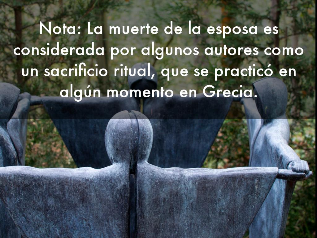 Nota: La muerte de la esposa es considerada por algunos autores como un sacrificio ritual, que se practicó en algún momento en Grecia.