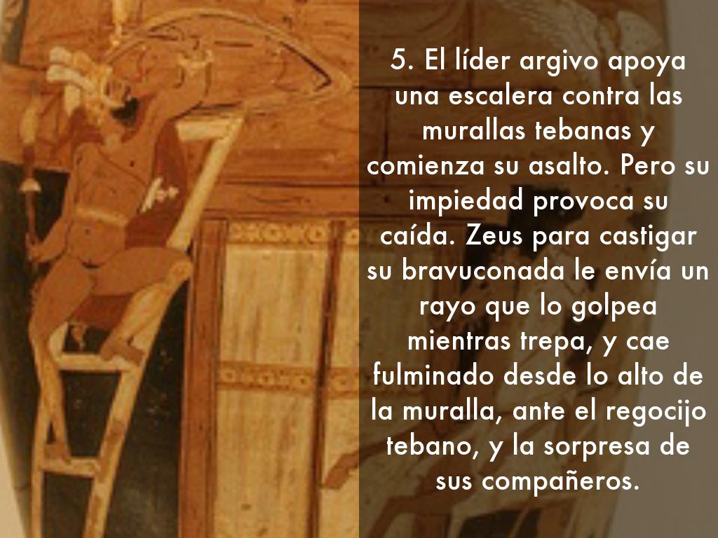 5. El líder argivo apoya una escalera contra las murallas tebanas y comienza su asalto. Pero su impiedad provoca su caída. Zeus para castigar su bravuconada le envía un rayo que lo golpea mientras trepa, y cae fulminado desde lo alto de la muralla, ante el regocijo tebano, y la sorpresa de sus compañeros.