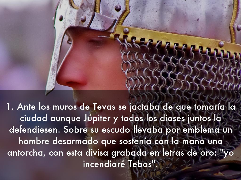 1. Ante los muros de Tevas se jactaba de que tomaría la ciudad aunque Júpiter y todos los dioses juntos la defendiesen. Sobre su escudo llevaba por emblema un hombre desarmado que sostenía con la mano una antorcha, con esta divisa grabada en letras de oro: "yo incendiaré Tebas".