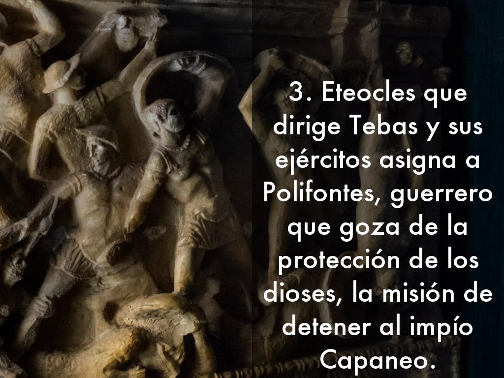 3. Eteocles que dirige Tebas y sus ejércitos asigna a Polifontes, guerrero que goza de la protección de los dioses, la misión de detener al impío Capaneo.