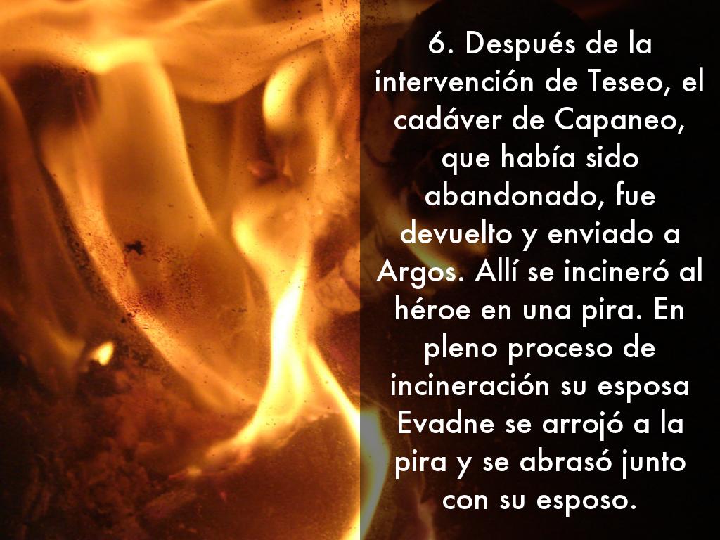 6. Después de la intervención de Teseo, el cadáver de Capaneo, que había sido abandonado, fue devuelto y enviado a Argos. Allí se incineró al héroe en una pira. En pleno proceso de incineración su esposa Evadne se arrojó a la pira y se abrasó junto con su esposo.