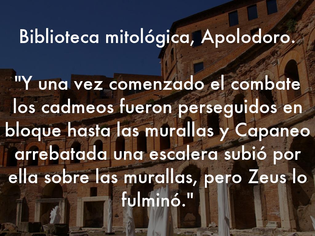 "Y una vez comenzado el combate los cadmeos fueron perseguidos en bloque hasta las murallas y Capaneo arrebatada una escalera subió por ella sobre las murallas, pero Zeus lo fulminó."