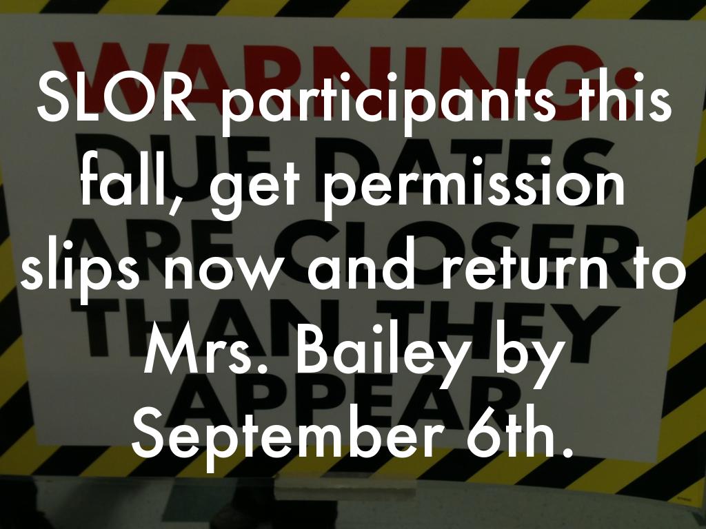 SLOR participants this fall, get permission slips now and return to Mrs. Bailey by September 6th.