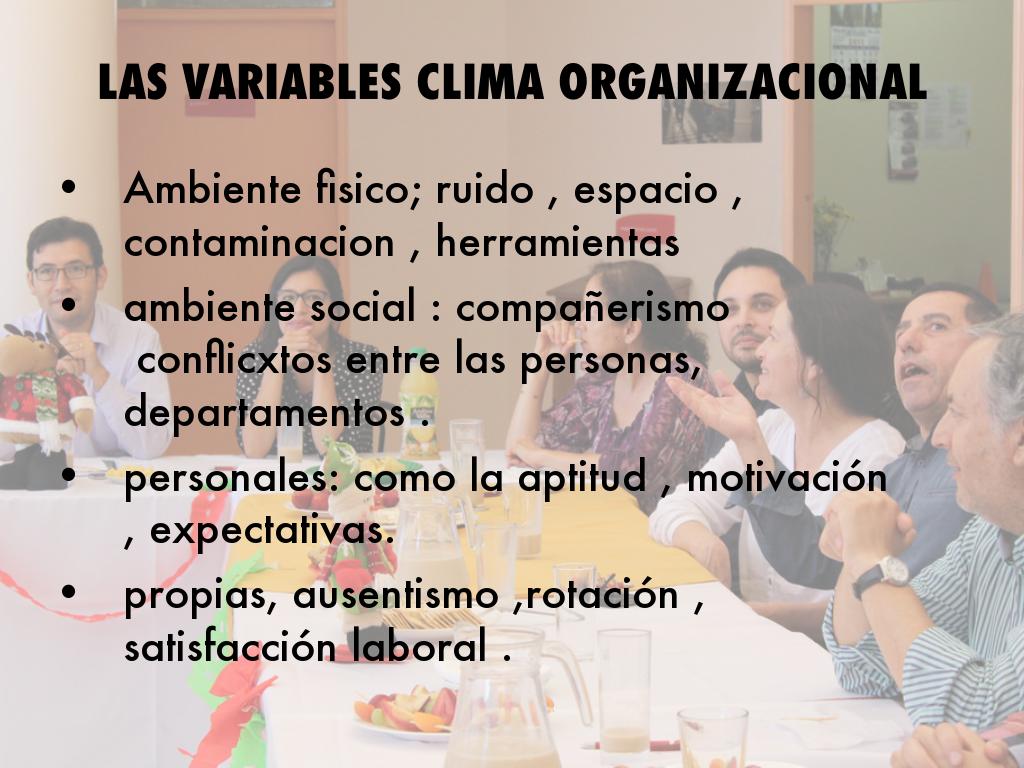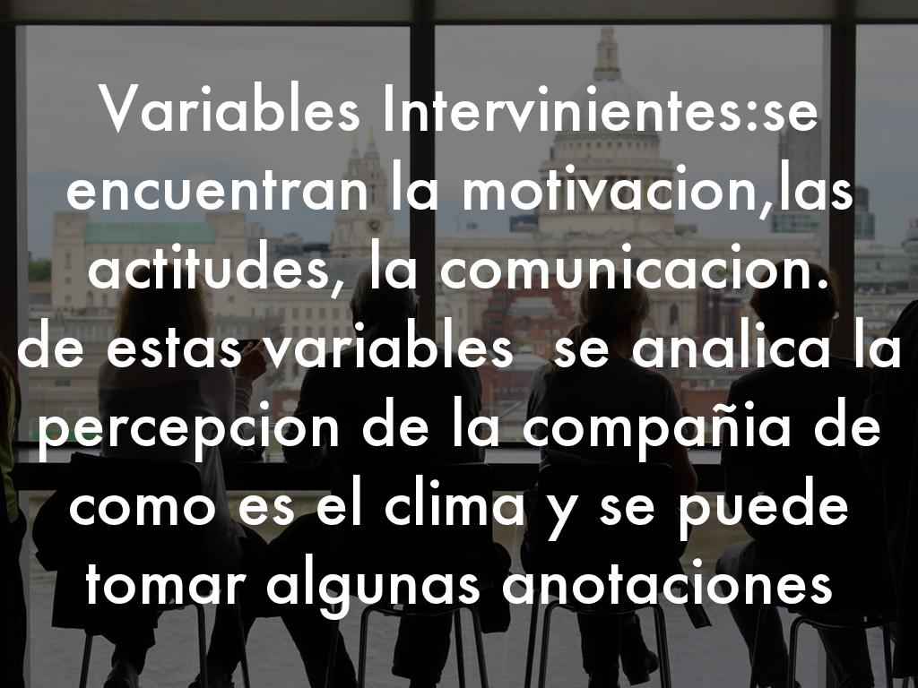 Variables Intervinientes:se encuentran la motivacion,las actitudes, la comunicacion. de estas variables se analica la percepcion de la compañia de como es el clima y se puede tomar algunas anotaciones