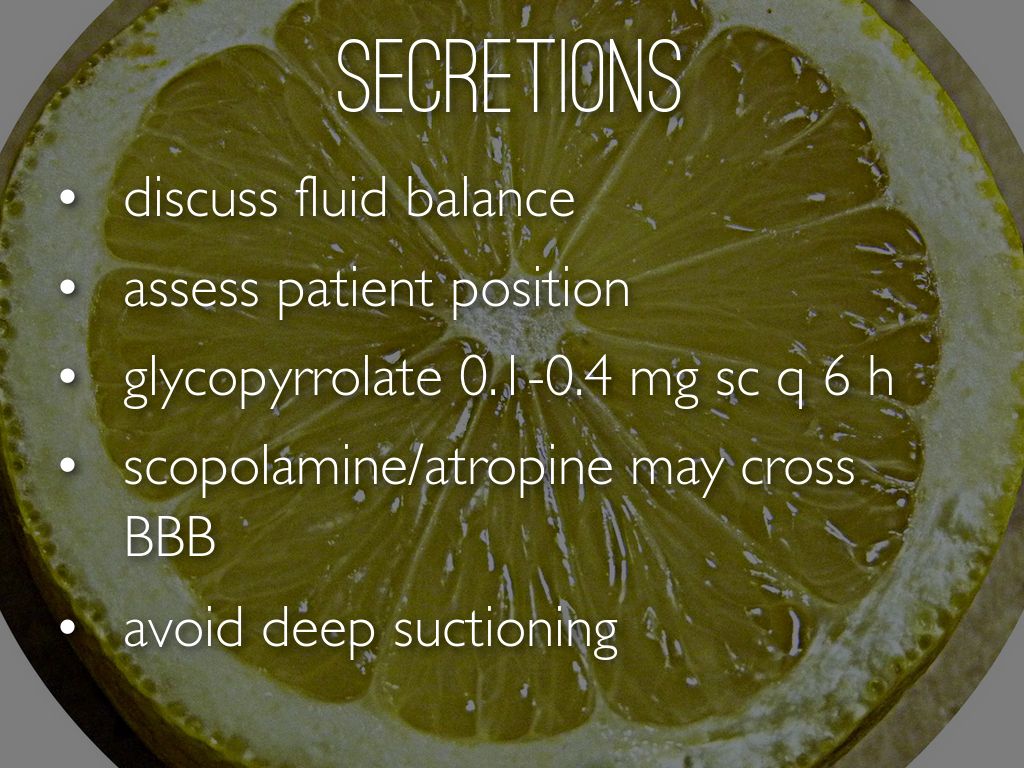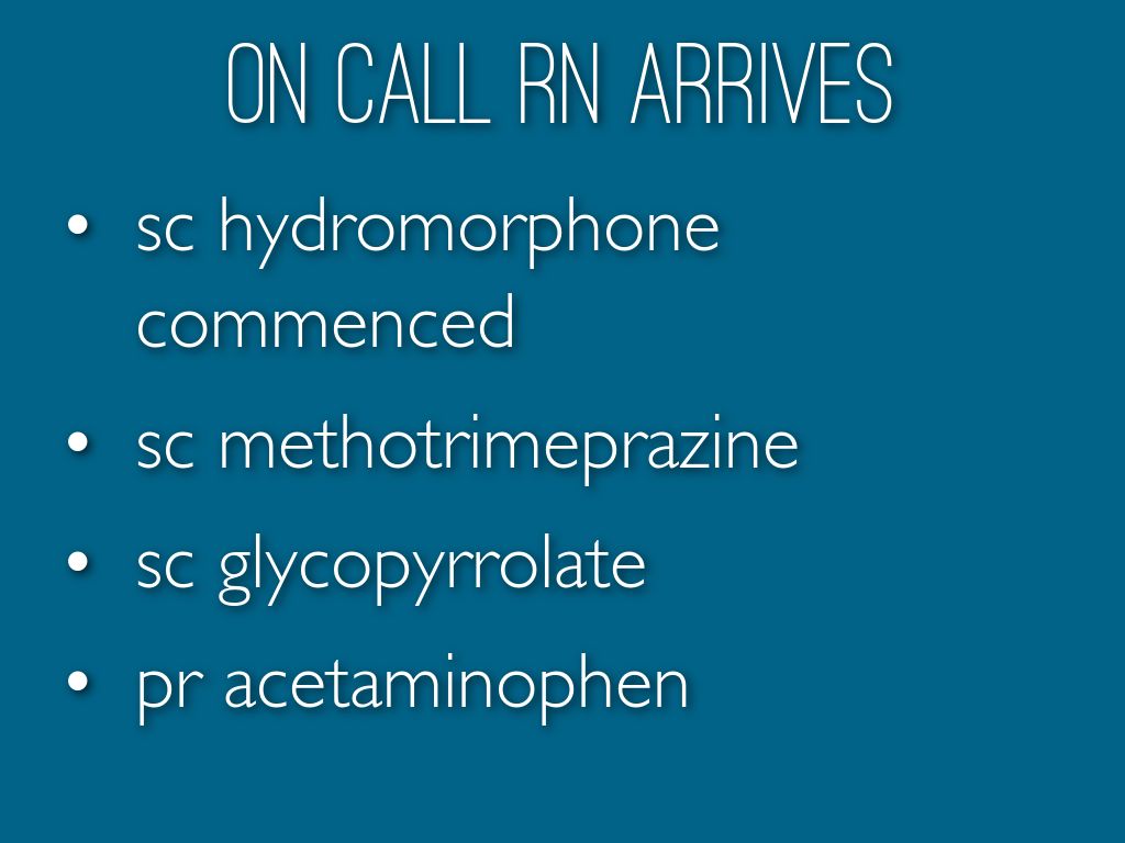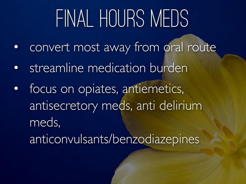 focus on opiates, antiemetics, antisecretory meds, anti delirium meds, anticonvulsants/benzodiazepines