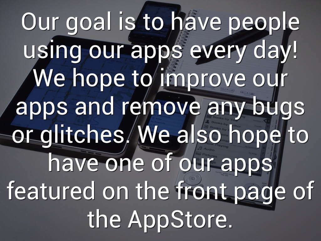 Our goal is to have people using our apps every day! We hope to improve our apps and remove any bugs or glitches. We also hope to have one of our apps featured on the front page of the AppStore.