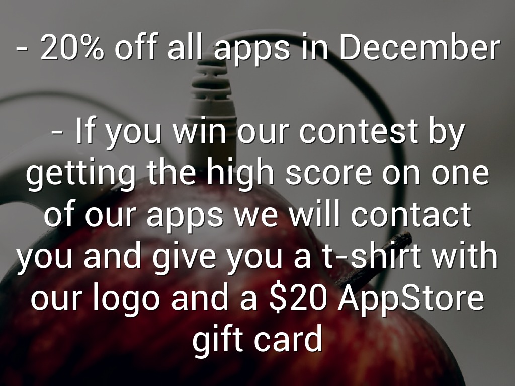 - If you win our contest by getting the high score on one of our apps we will contact you and give you a t-shirt with our logo and a $20 AppStore gift card