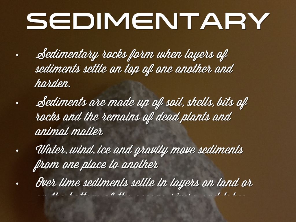 Over time sediments settle in layers on land or on the bottom of the oceans, rivers, and lakes.