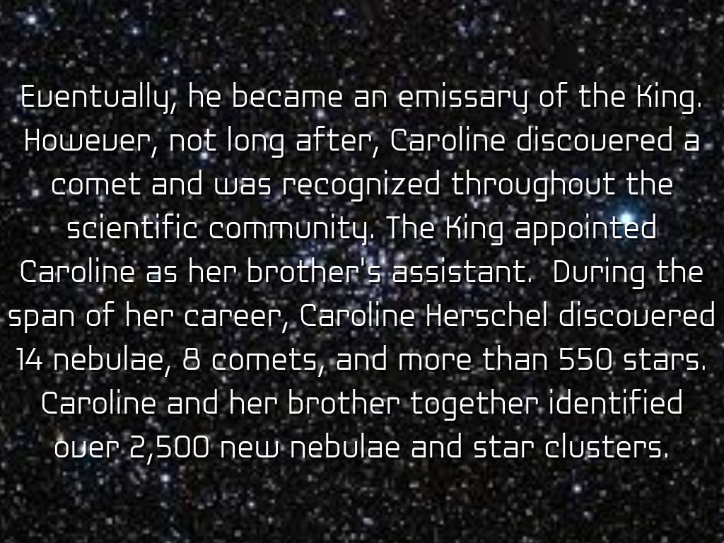 Eventually, he became an emissary of the King. However, not long after, Caroline discovered a comet and was recognized throughout the scientific community. The King appointed Caroline as her brother's assistant. During the span of her career, Caroline Herschel discovered 14 nebulae, 8 comets, and more than 550 stars. Caroline and her brother together identified over 2,500 new nebulae and star clusters.