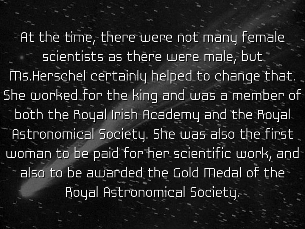 At the time, there were not many female scientists as there were male, but Ms.Herschel certainly helped to change that. She worked for the king and was a member of both the Royal Irish Academy and the Royal Astronomical Society. She was also the first woman to be paid for her scientific work, and also to be awarded the Gold Medal of the Royal Astronomical Society.