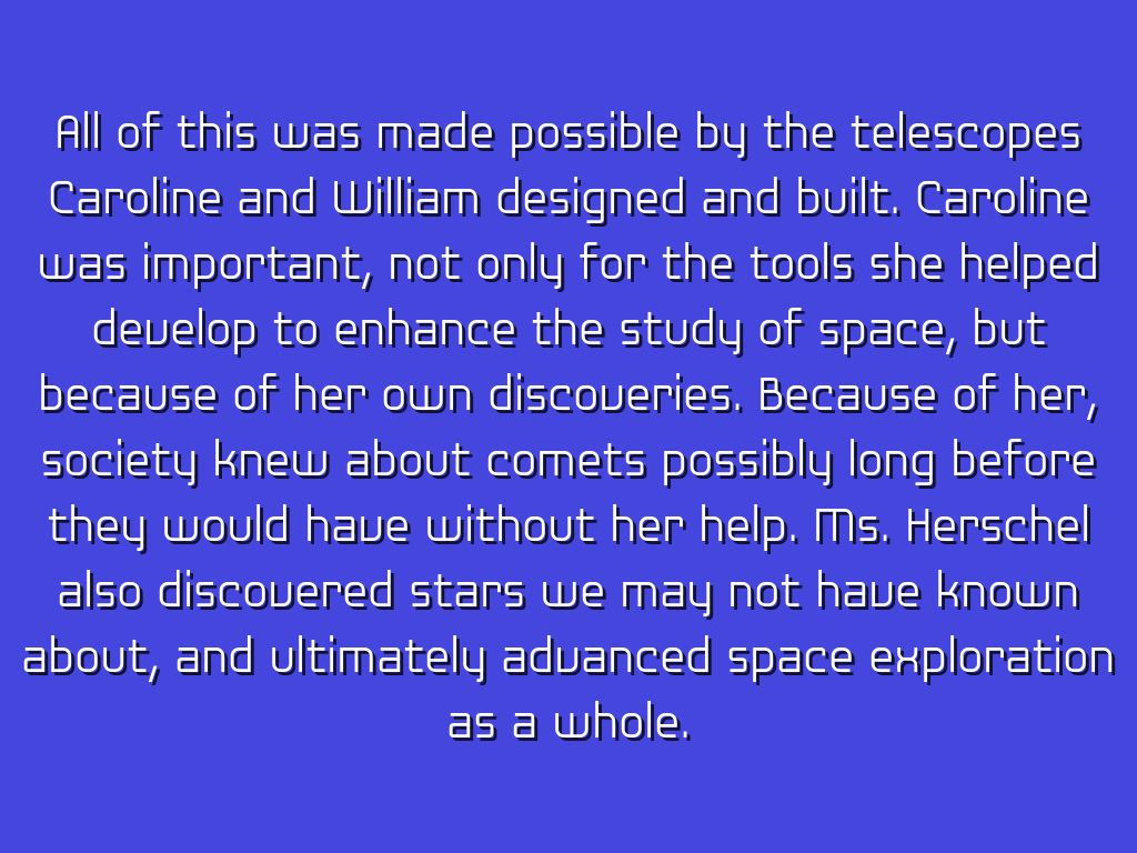 All of this was made possible by the telescopes Caroline and William designed and built. Caroline was important, not only for the tools she helped develop to enhance the study of space, but because of her own discoveries. Because of her, society knew about comets possibly long before they would have without her help. Ms. Herschel also discovered stars we may not have known about, and ultimately advanced space exploration as a whole.