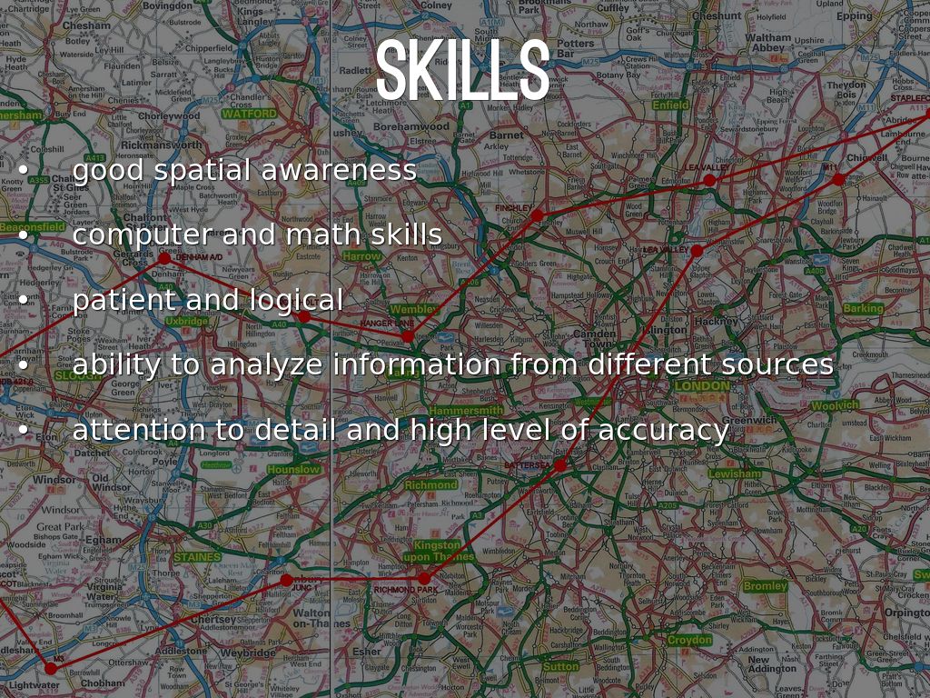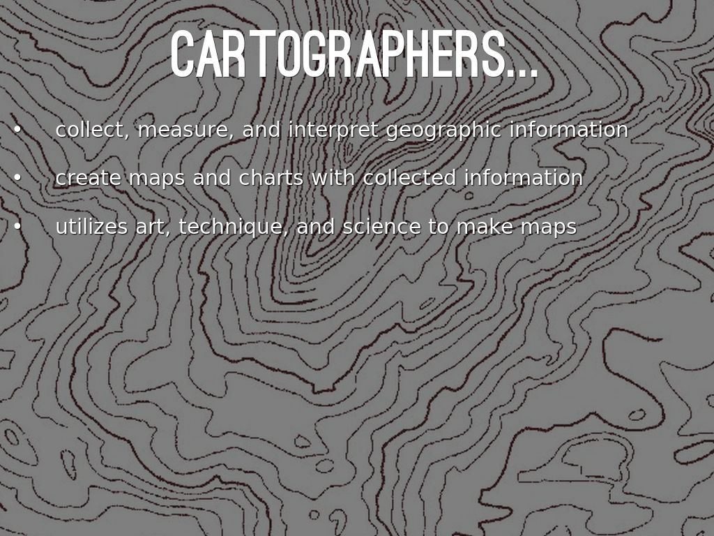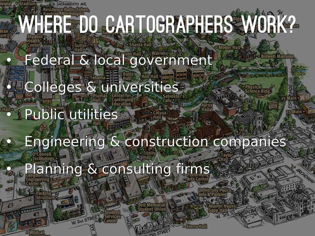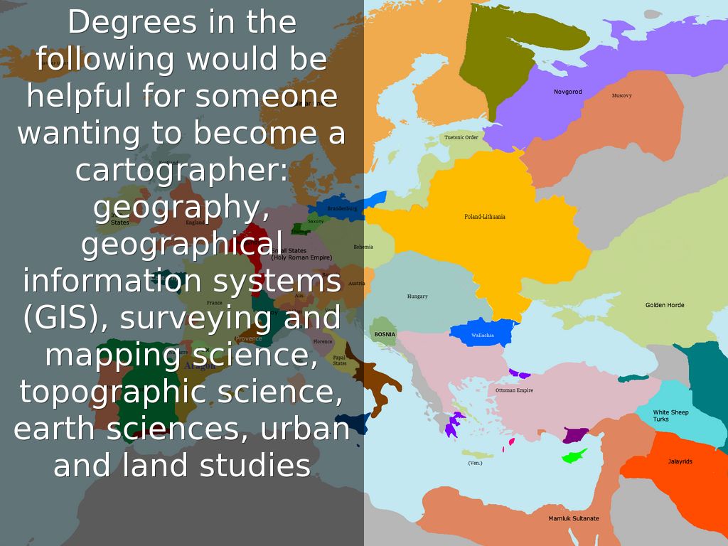 Degrees in the following would be helpful for someone wanting to become a cartographer: geography, geographical information systems (GIS), surveying and mapping science, topographic science, earth sciences, urban and land studies