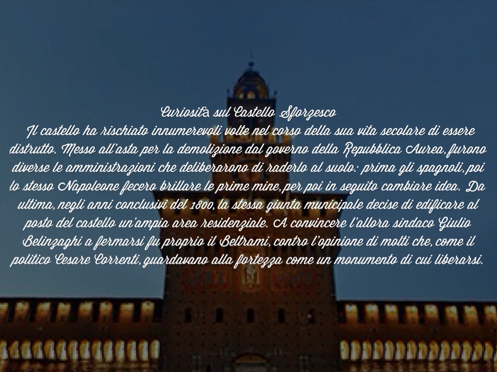 Il castello ha rischiato innumerevoli volte nel corso della sua vita secolare di essere distrutto. Messo all'asta per la demolizione dal governo della Repubblica Aurea, furono diverse le amministrazioni che deliberarono di raderlo al suolo: prima gli spagnoli, poi lo stesso Napoleone fecero brillare le prime mine, per poi in seguito cambiare idea. Da ultima, negli anni conclusivi del 1800, la stessa giunta municipale decise di edificare al posto del castello un'ampia area residenziale. A convincere l'allora sindaco Giulio Belinzaghi a fermarsi fu proprio il Beltrami, contro l'opinione di molti che, come il politico Cesare Correnti, guardavano alla fortezza come un monumento di cui liberarsi.