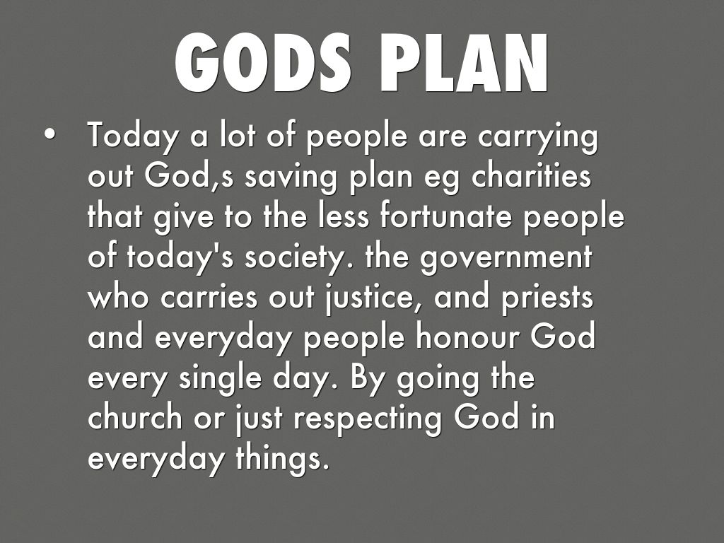 Today a lot of people are carrying out God,s saving plan eg charities that give to the less fortunate people of today's society. the government who carries out justice, and priests and everyday people honour God every single day. By going the church or just respecting God in everyday things.
