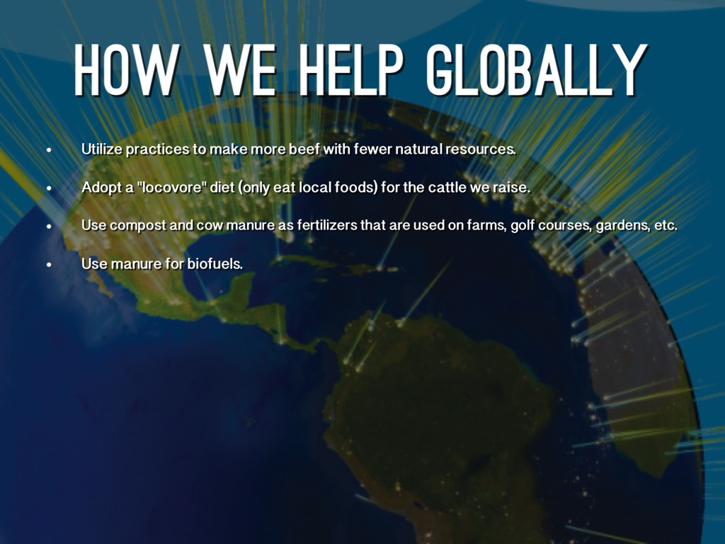Adopt a "locovore" diet (only eat local foods) for the cattle we raise.