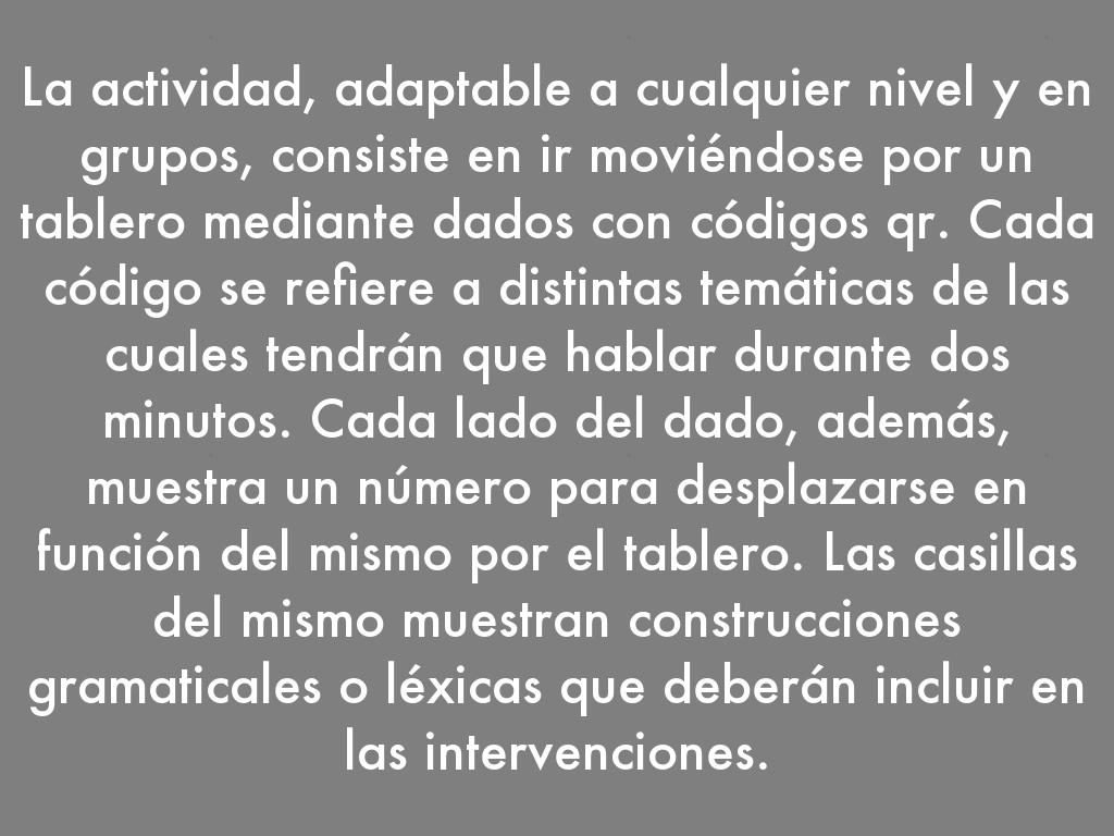 La actividad, adaptable a cualquier nivel y en grupos, consiste en ir moviéndose por un tablero mediante dados con códigos qr. Cada código se refiere a distintas temáticas de las cuales tendrán que hablar durante dos minutos. Cada lado del dado, además, muestra un número para desplazarse en función del mismo por el tablero. Las casillas del mismo muestran construcciones gramaticales o léxicas que deberán incluir en las intervenciones.