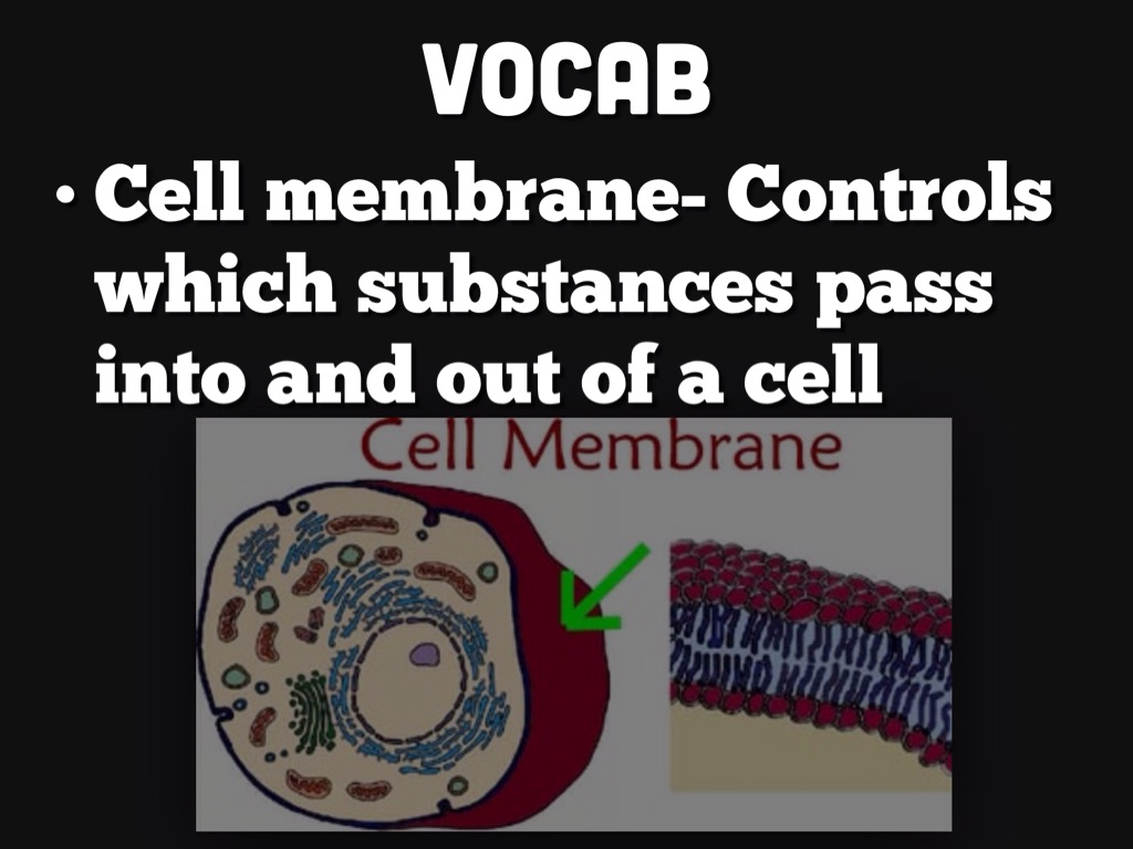 Cell membrane- Controls which substances pass into and out of a cell