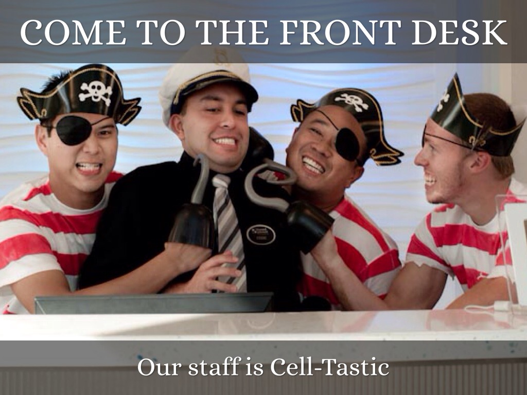 The nucleus is the control center of the cell and since the nucleus controls what's going on in the cell it reminded me of the front desk because there are people there that help control what's going on around the hotel/building and if there's a problem the front desk takes the complaints.