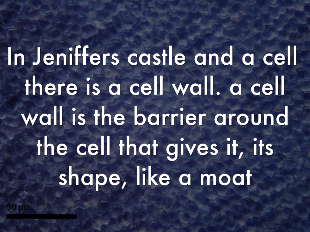 In Jeniffers castle and a cell there is a cell wall. a cell wall is the barrier around the cell that gives it, its shape, like a moat