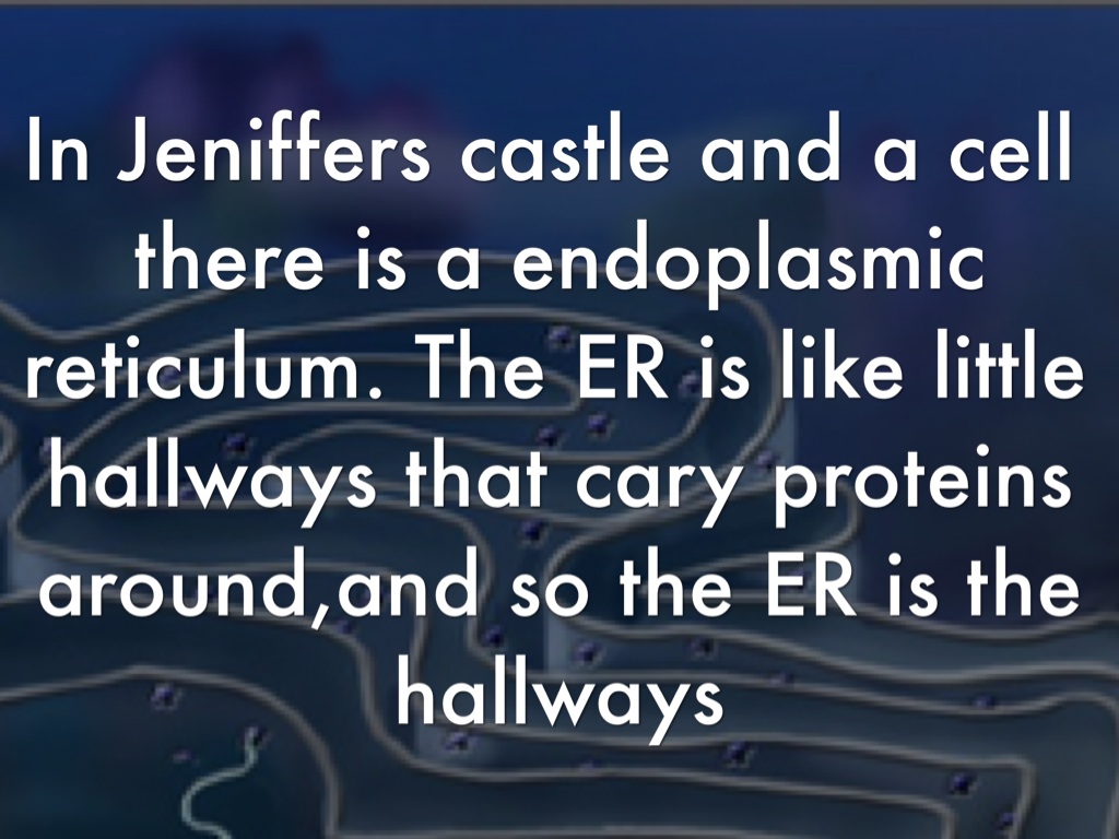 In Jeniffers castle and a cell there is a endoplasmic reticulum. The ER is like little hallways that cary proteins around,and so the ER is the hallways