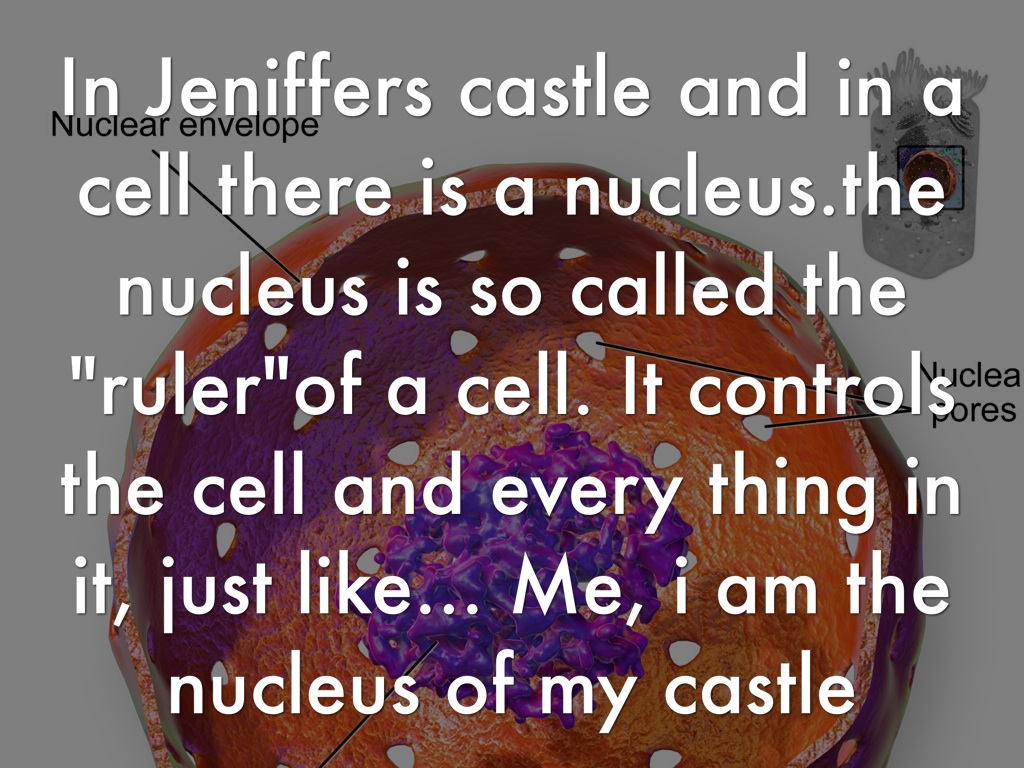 In Jeniffers castle and in a cell there is a nucleus.the nucleus is so called the "ruler"of a cell. It controls the cell and every thing in it, just like... Me, i am the nucleus of my castle