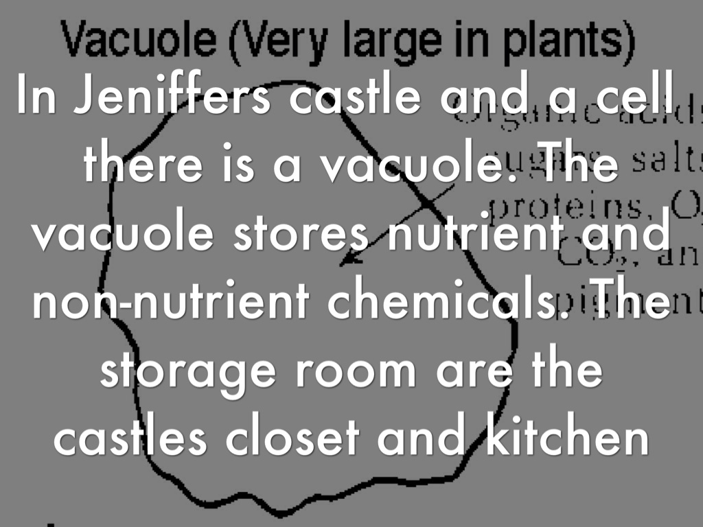 In Jeniffers castle and a cell there is a vacuole. The vacuole stores nutrient and non-nutrient chemicals. The storage room are the castles closet and kitchen