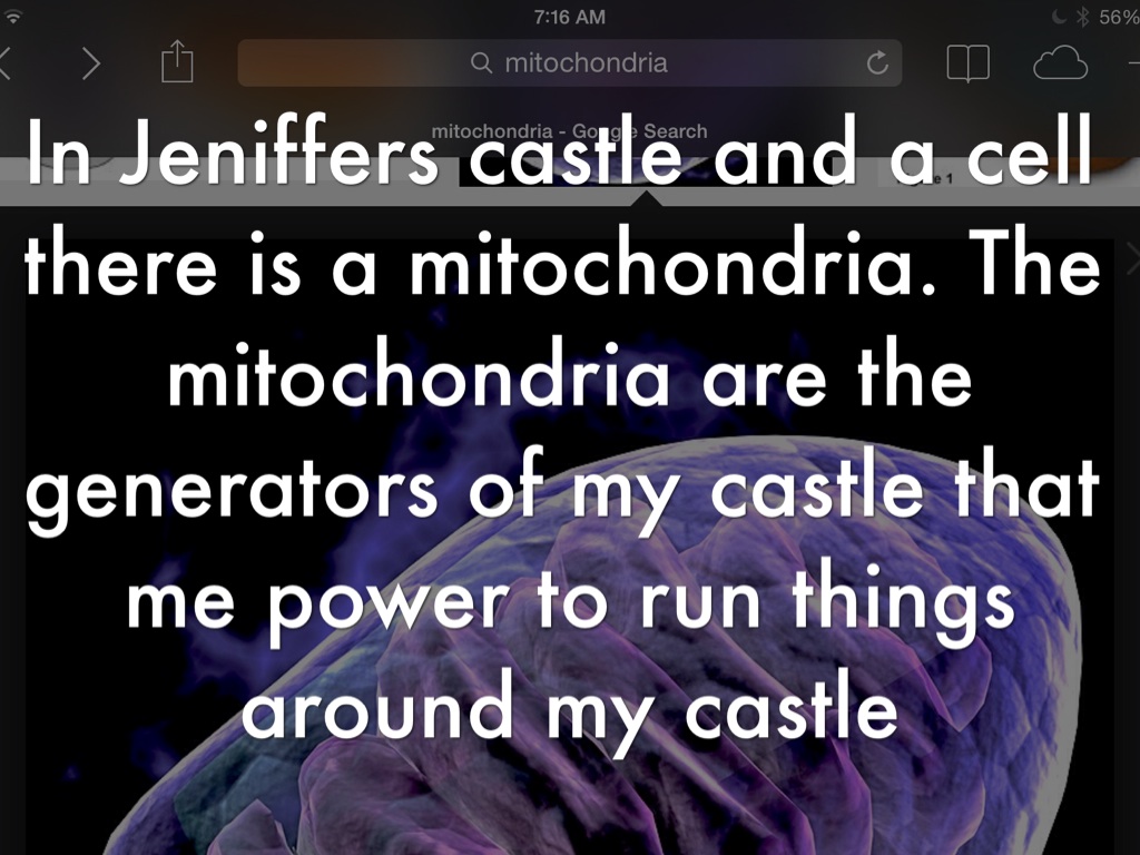 In Jeniffers castle and a cell there is a mitochondria. The mitochondria are the generators of my castle that me power to run things around my castle