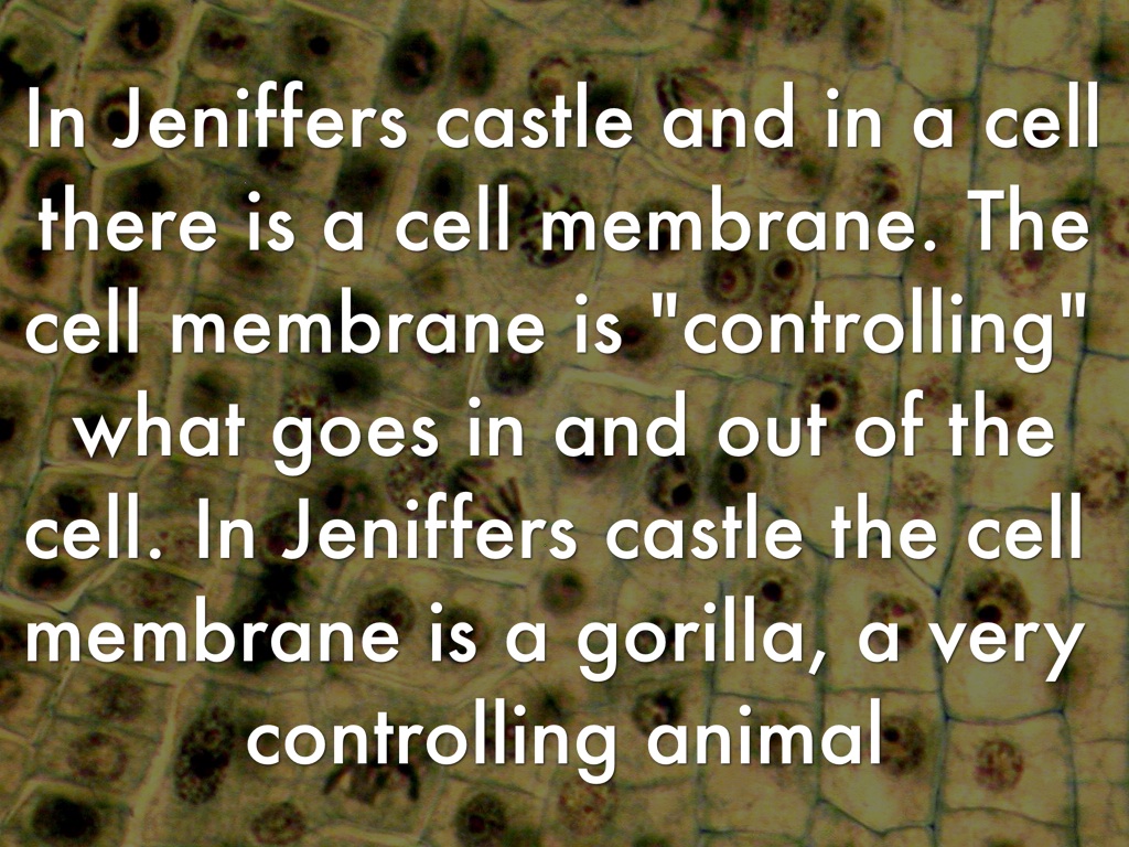 In Jeniffers castle and in a cell there is a cell membrane. The cell membrane is "controlling" what goes in and out of the cell. In Jeniffers castle the cell membrane is a gorilla, a very controlling animal