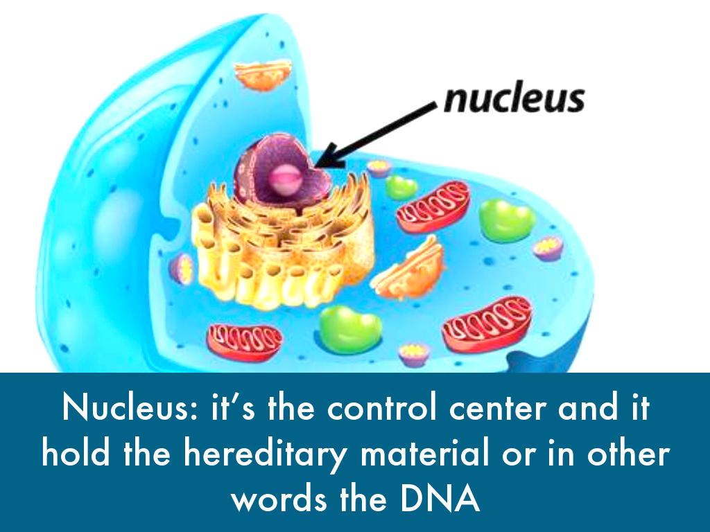 Nucleus: it’s the control center and it hold the hereditary material or in other words the DNA