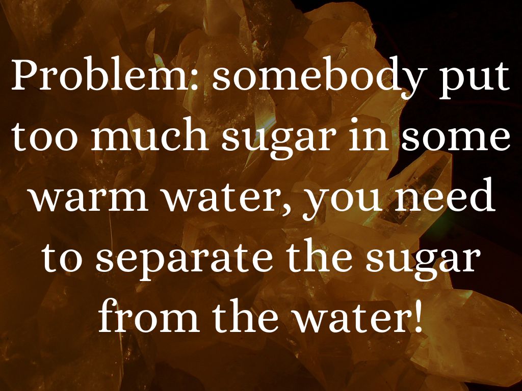 Problem: somebody put too much sugar in some warm water, you need to separate the sugar from the water!