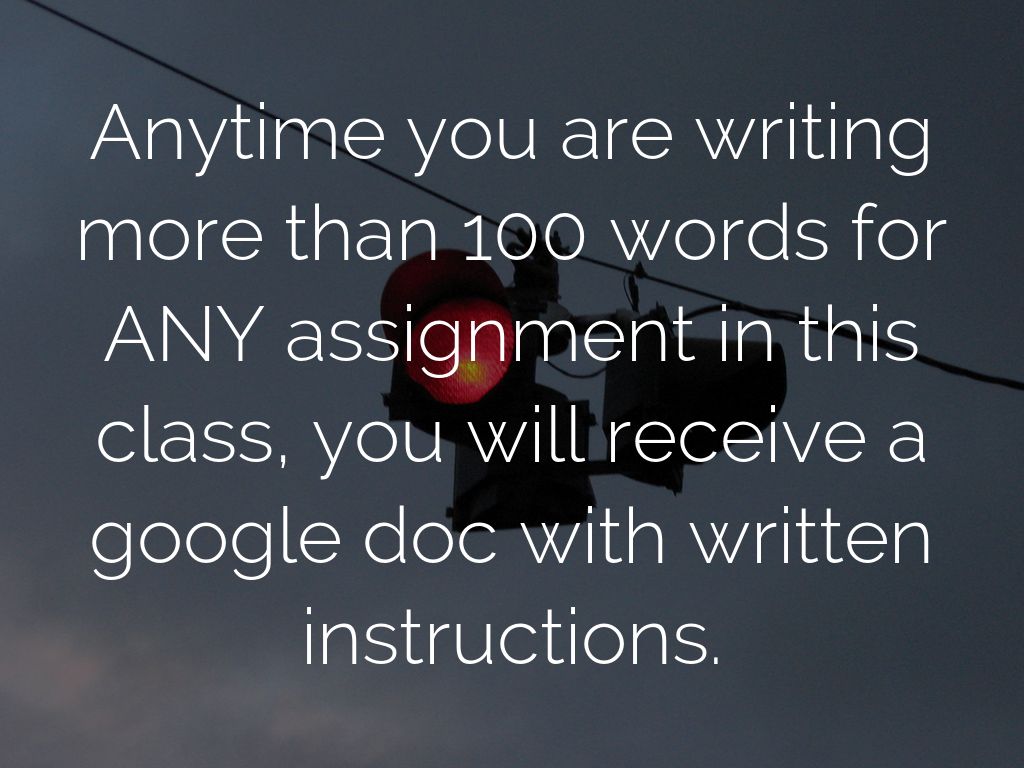 Anytime you are writing more than 100 words for ANY assignment in this class, you will receive a google doc with written instructions.