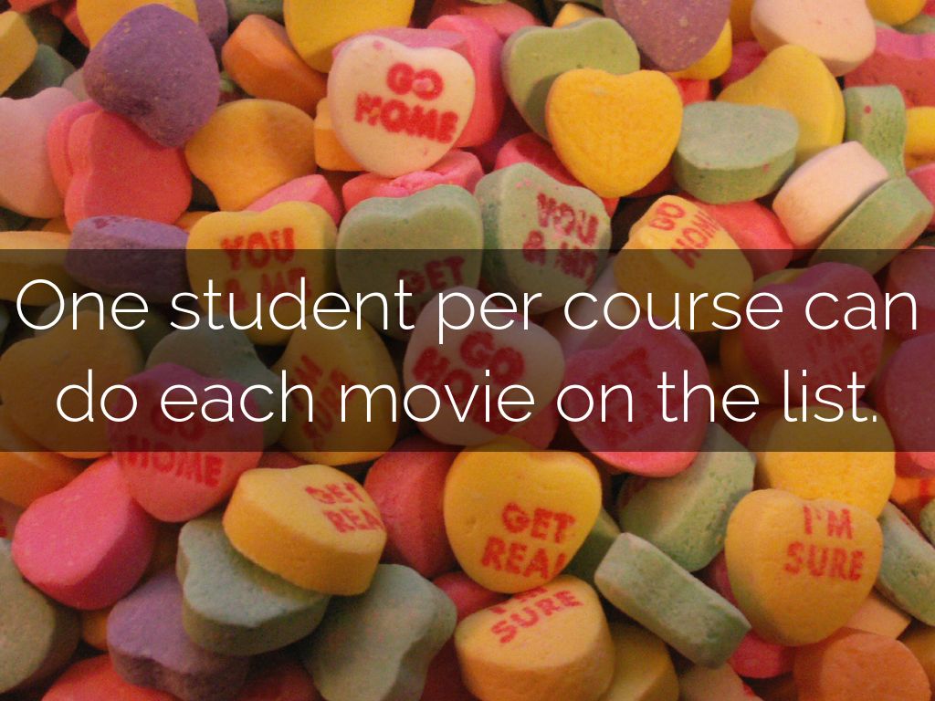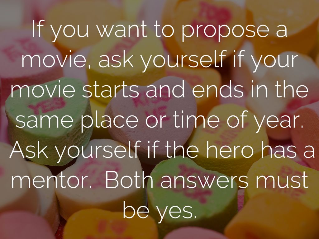 If you want to propose a movie, ask yourself if your movie starts and ends in the same place or time of year. Ask yourself if the hero has a mentor. Both answers must be yes.