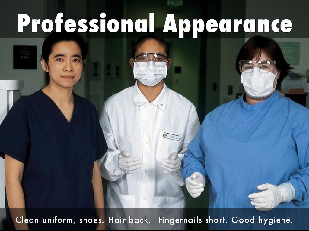 Clean uniform, shoes. Hair back. Fingernails short. Good hygiene.