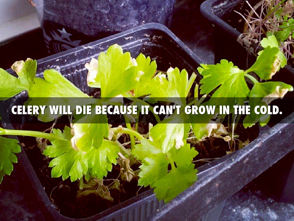CELERY WILL DIE BECAUSE IT CAN'T GROW IN THE COLD.