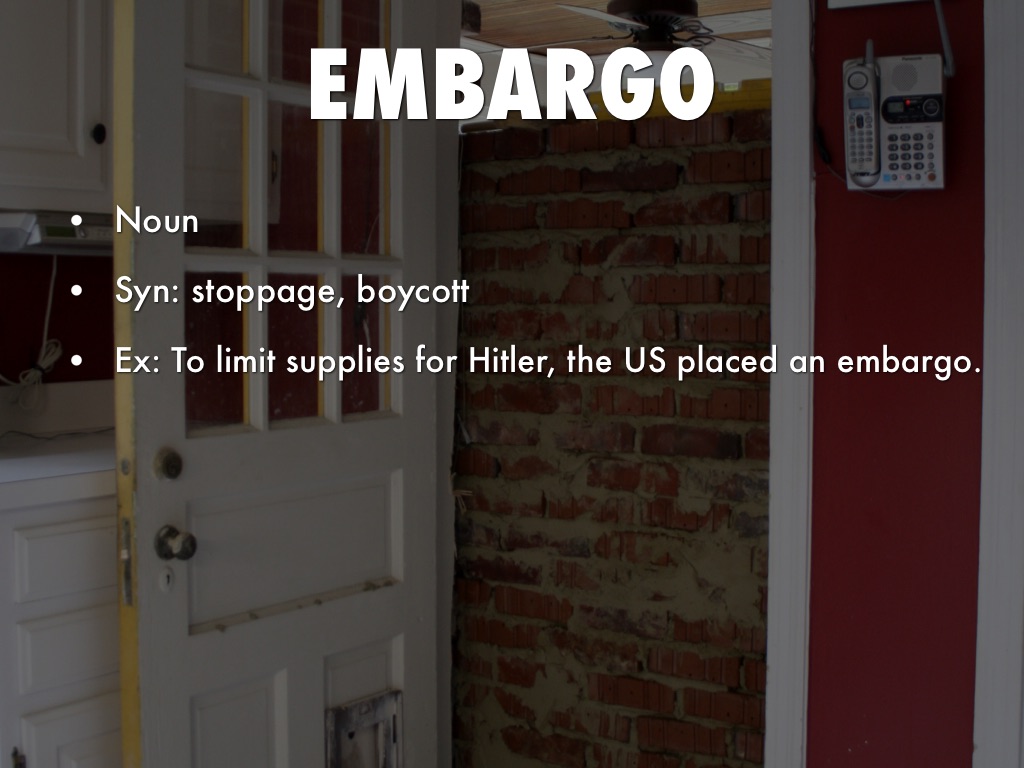 • Ex: To limit supplies for Hitler, the US placed an embargo.