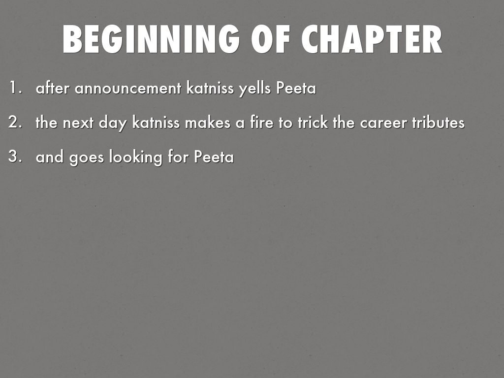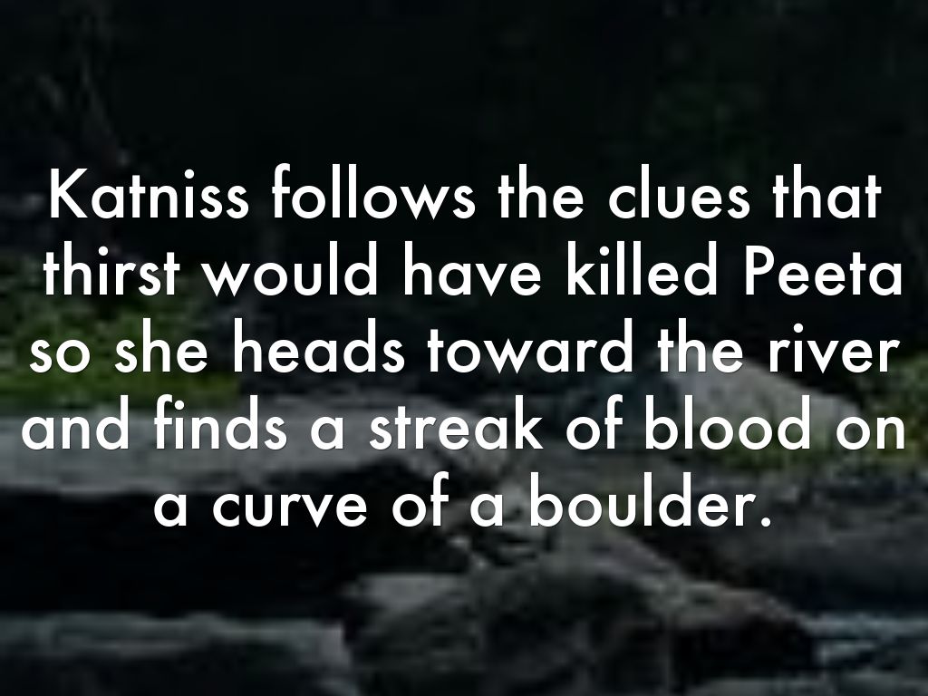 Katniss follows the clues that thirst would have killed Peeta so she heads toward the river and finds a streak of blood on a curve of a boulder.