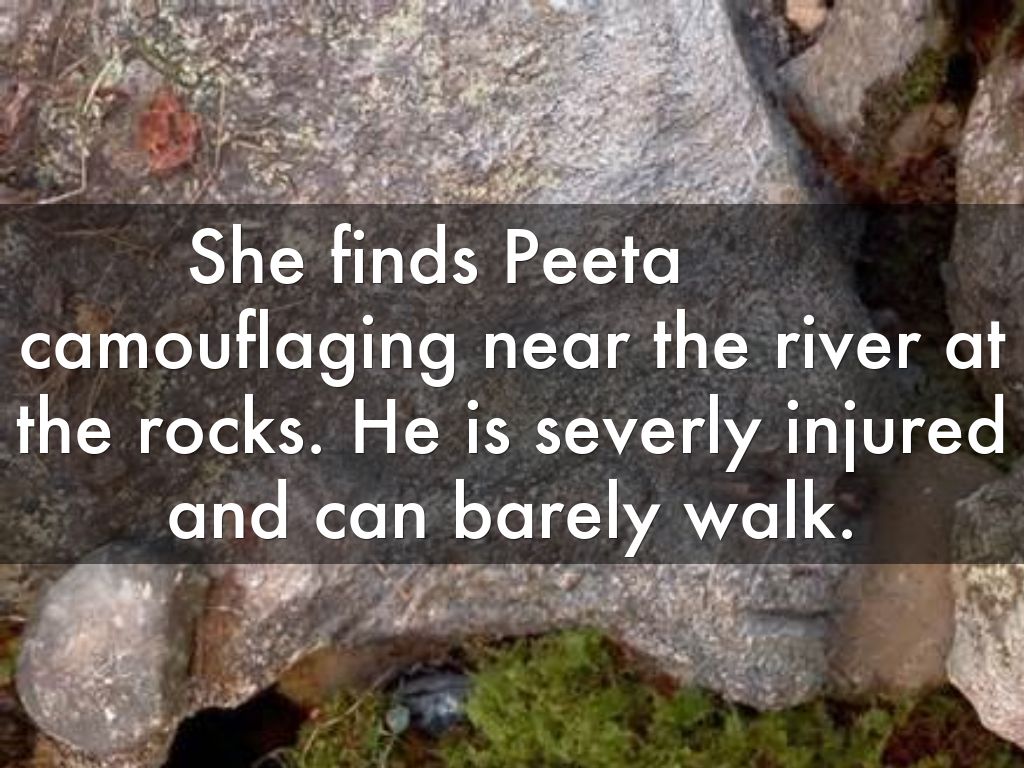 She finds Peeta camouflaging near the river at the rocks. He is severly injured and can barely walk.
