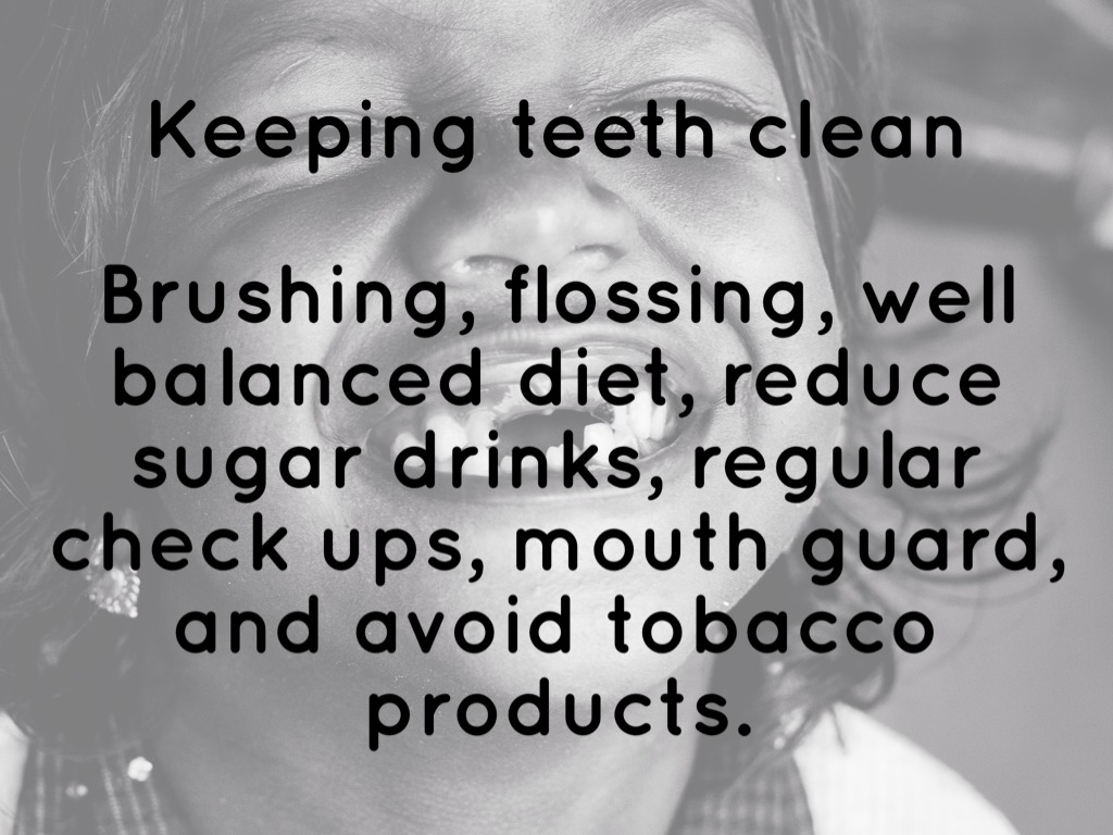 Brushing, flossing, well balanced diet, reduce sugar drinks, regular check ups, mouth guard, and avoid tobacco products.