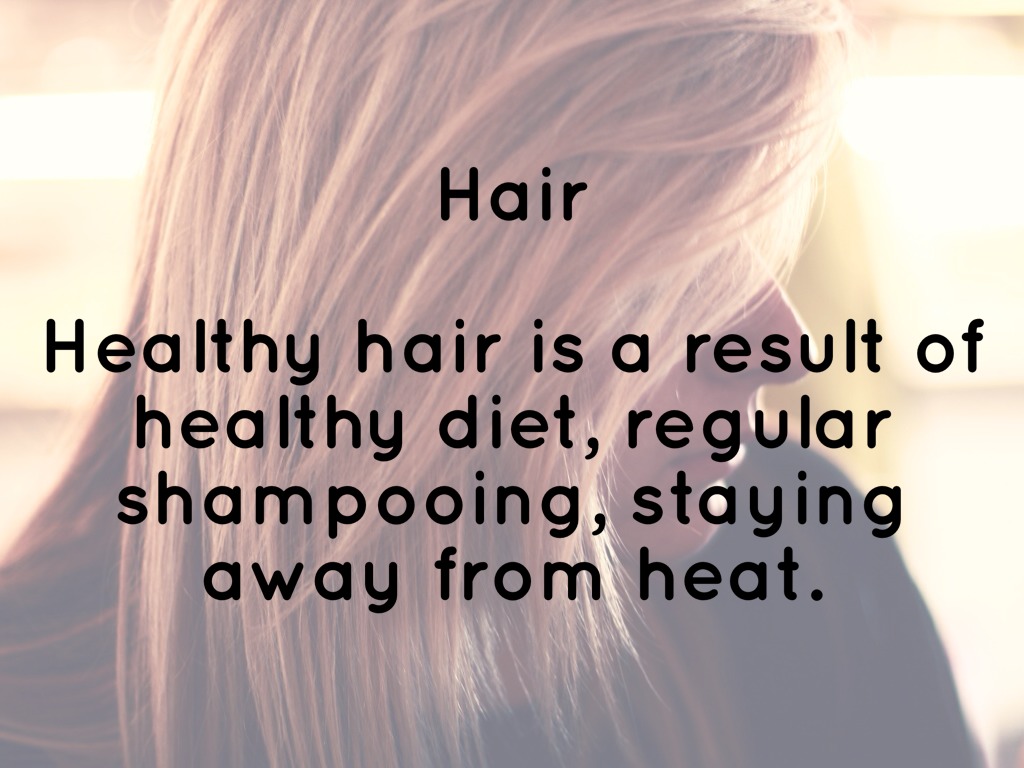 Healthy hair is a result of healthy diet, regular shampooing, staying away from heat.