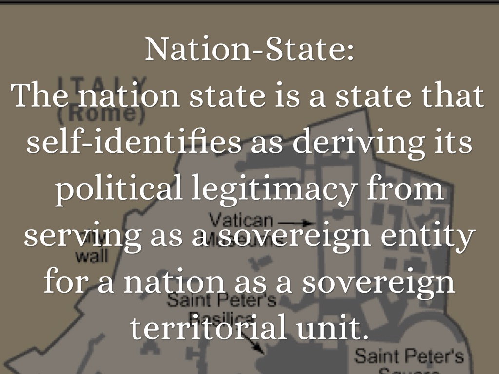 The nation state is a state that self-identifies as deriving its political legitimacy from serving as a sovereign entity for a nation as a sovereign territorial unit.