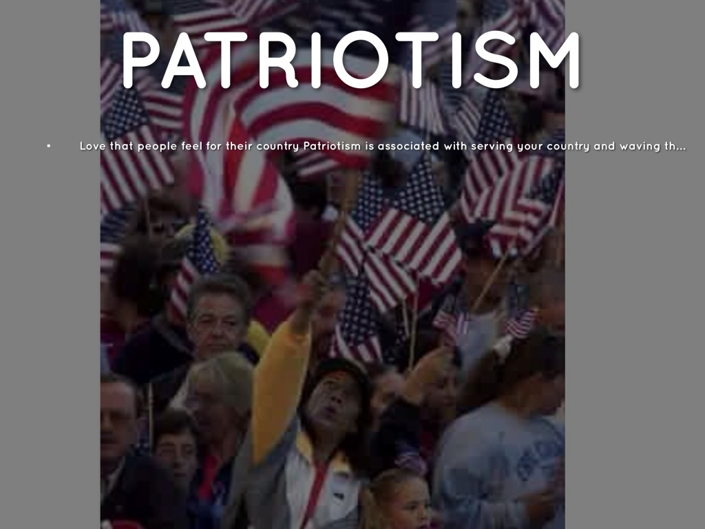 • Love that people feel for their country Patriotism is associated with serving your country and waving the flag.
