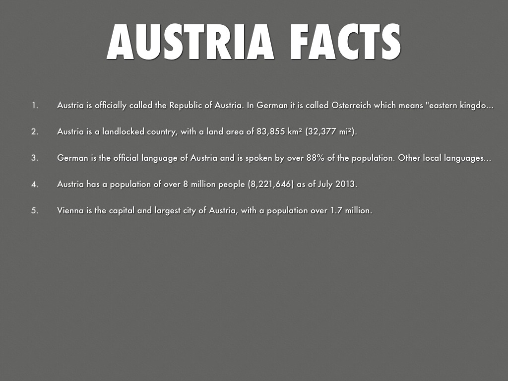 Austria is officially called the Republic of Austria. In German it is called Osterreich which means "eastern kingdom" or "eastern empire".