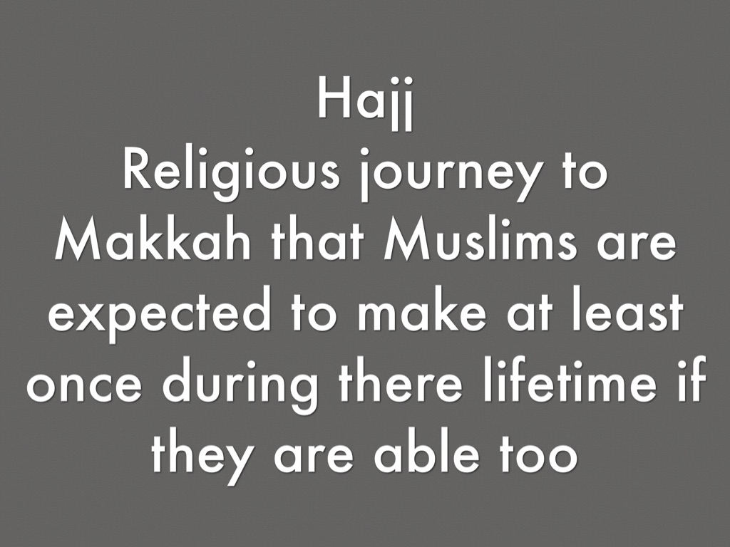 Religious journey to Makkah that Muslims are expected to make at least once during there lifetime if they are able too
