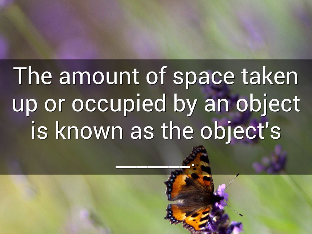 The amount of space taken up or occupied by an object is known as the object's _______.
