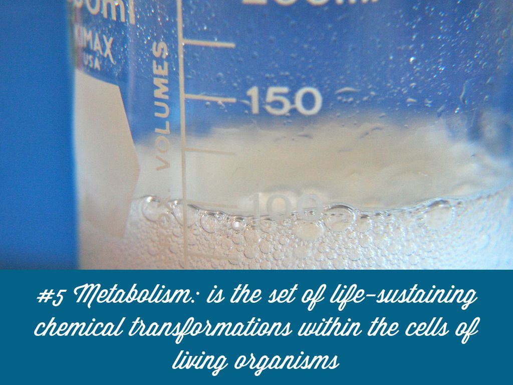 #5 Metabolism: is the set of life-sustaining chemical transformations within the cells of living organisms
