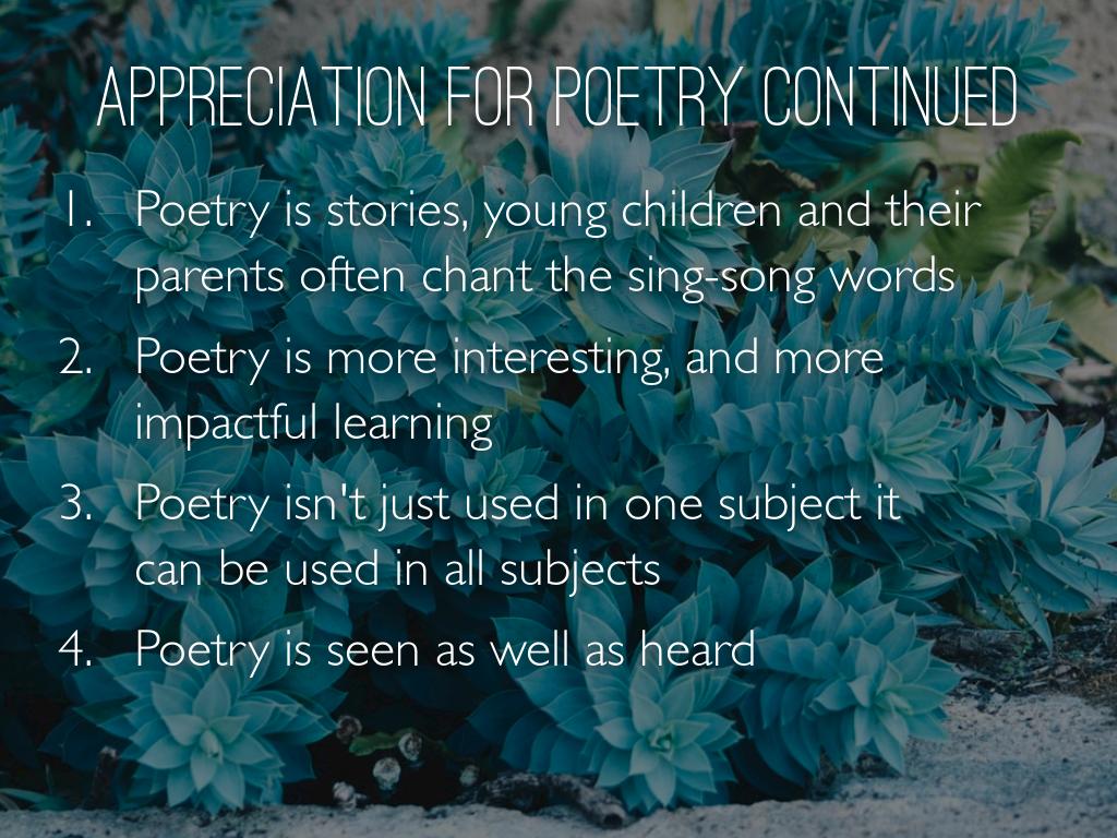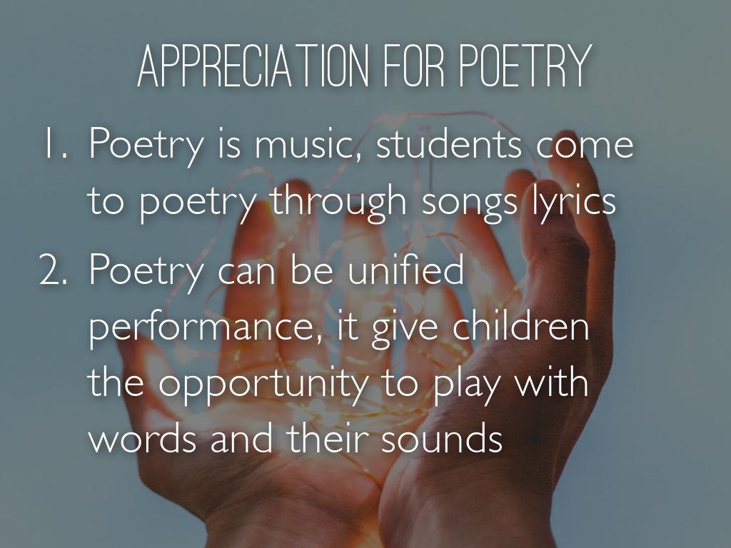 Poetry can be unified performance, it give children the opportunity to play with words and their sounds