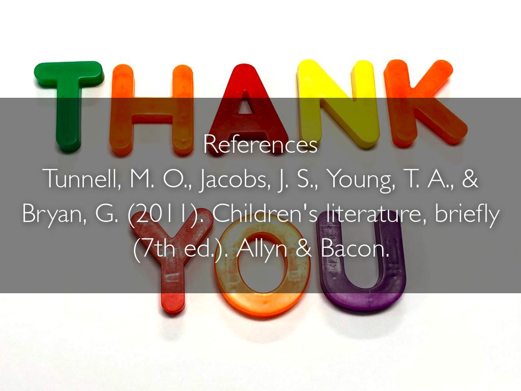 Tunnell, M. O., Jacobs, J. S., Young, T. A., & Bryan, G. (2011). Children's literature, briefly (7th ed.). Allyn & Bacon.