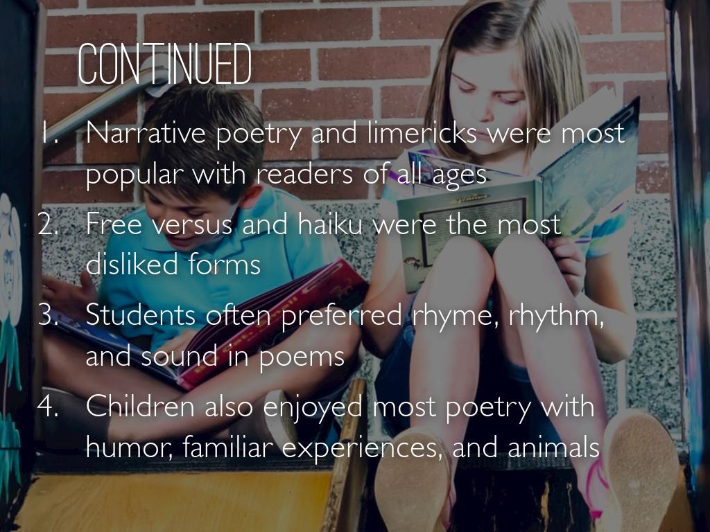 Children also enjoyed most poetry with humor, familiar experiences, and animals