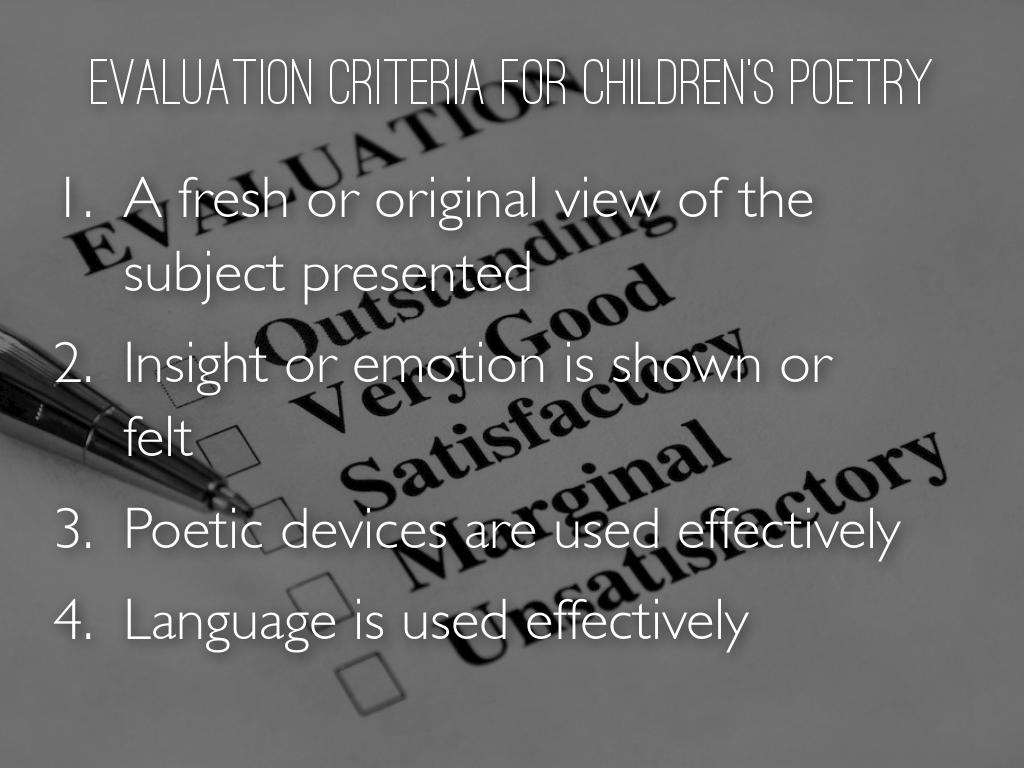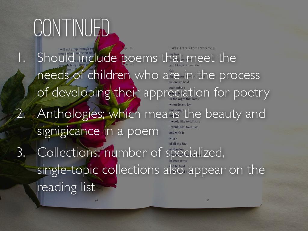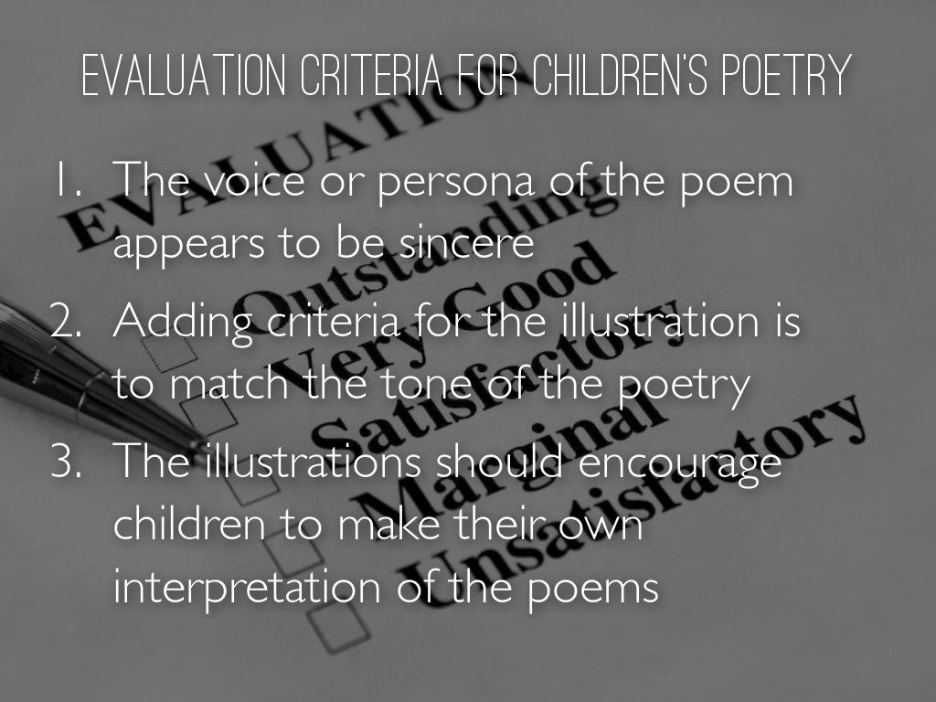 Should include poems that meet the needs of children who are in the process of developing their appreciation for poetry
