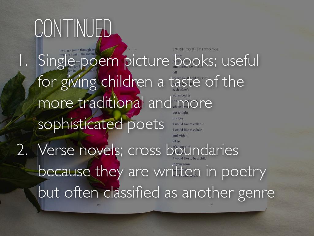 Verse novels; cross boundaries because they are written in poetry but often classified as another genre